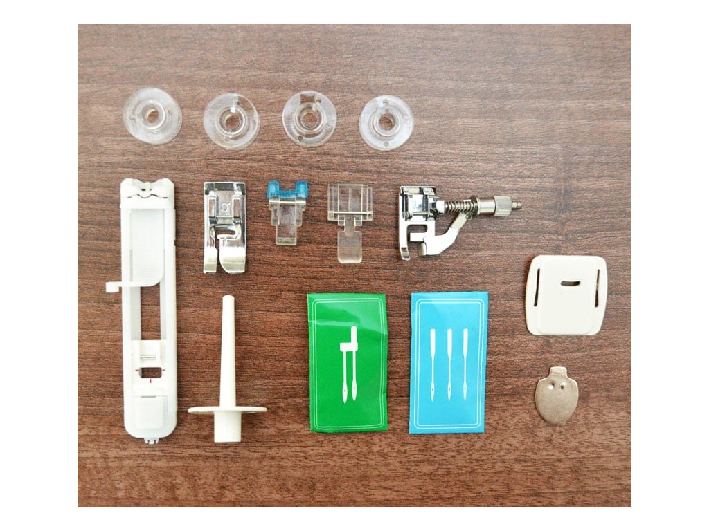 U stroje je praktická taštička s příslušenstvím. V ní najdete patku základní, patku na šití zipů, patku na šití knoflíkových dírek, patku na přišívání knoflíků, patku na slepý steh, dvojjehlu, kolík na druhou nit, krytku na zoubky, 4 cívky spodní nitě, šroubovák a náhradní jehly. Samozřejmostí je český návod a pedál s kabelem.