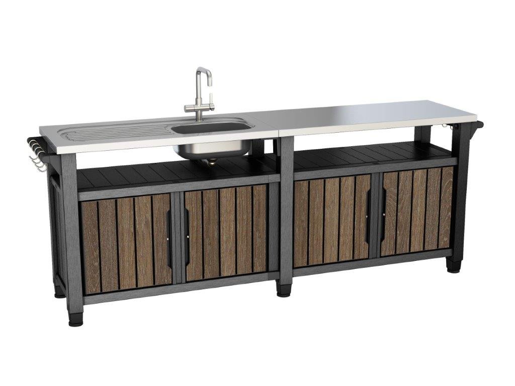 Rádi si v létě posedíte s rodinou a s přáteli venku na zahradě? Holdujete grilovaným pokrmům? Grilovací stolek Keter Unity Chef nabízí úžasnou kapacitu 415 litrů pro uložení kuchařského náčiní. Nerezová pracovní deska, integrovaný dřez, praktická rukojeť s háčky na pověšení utěrek, nastavitelné nohy stolku, otvírák na láhve a extra velká užitná police na skleničky a talíře dohromady vytvářejí dokonalý kuchyňský ostrůvek pro venkovní vaření, grilování, přípravu a servírování pokrmů a nápojů i pro mytí a utírání nádobí. Tento multifunkční grilovací stůl si prostě zamilujete!
