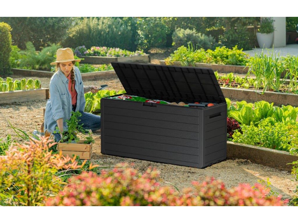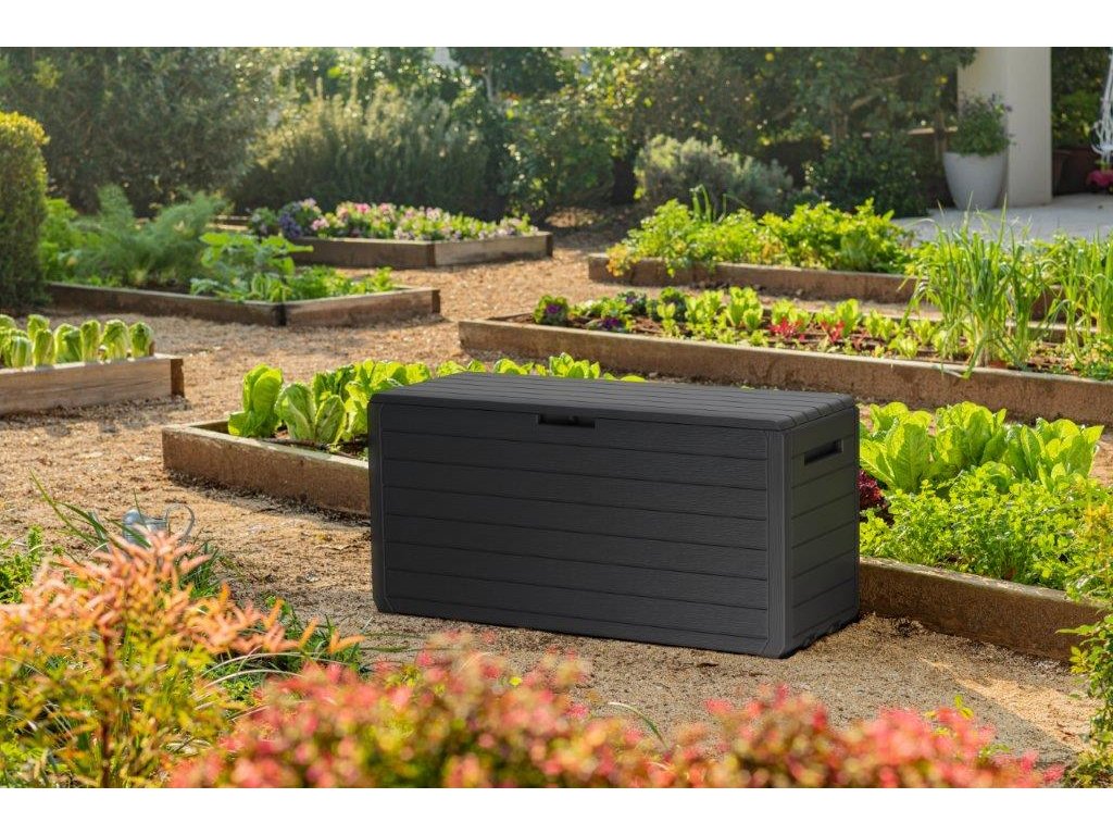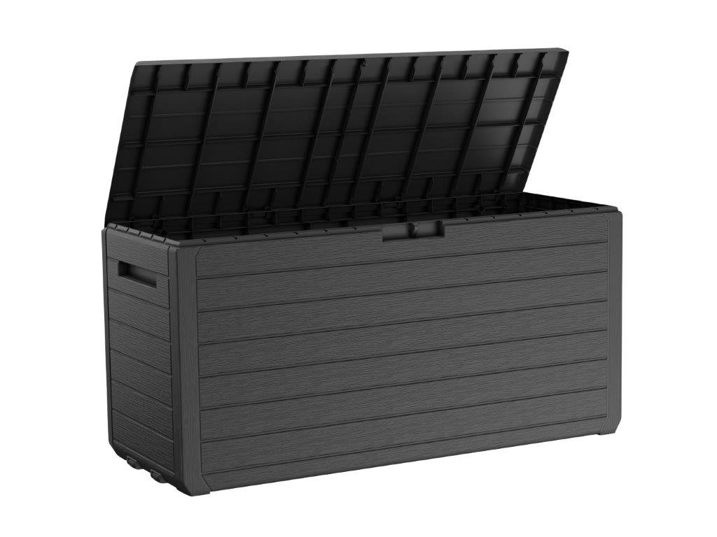 Grafitová barva s texturou imitace dřeva dodává boxu elegantní vzhled, který se hodí na terasu i do zahradního altánu. Díky odolnému materiálu a kvalitnímu zpracování si box zachová svůj vzhled i po letech používání.