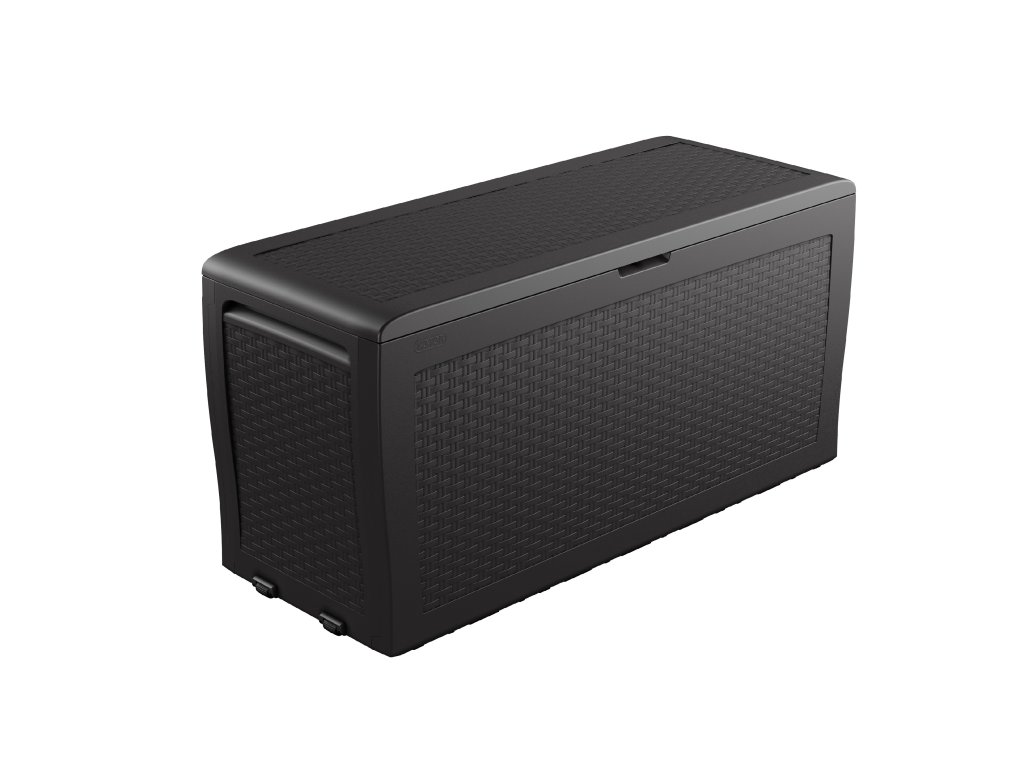 Zahradní box je vyrobený z vysoce kvalitní polypropylenové pryskyřice v moderním designu, který imituje strukturu přírodního ratanu. Skříň je nízká a její dno zvládne unést až 30 kg nákladu a víko vydrží zatížení až 150 kg, takže je ideální i pro skladování podstatně težších věcí. Stěny jsou vyztužené žebrovými segmenty, takže skříň hravě odolá i drsnému zacházení a vandalismu a nevadí ji ani extrémní počasí či UV záření.