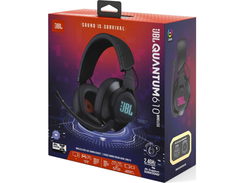 Sluchátka JBL Quantum 610 Wireless jsou prostřednictvím 2,4GHz bezdrátového připojení kompatibilní s PC, PS (PS5 a PS4) a Nintendo Switch (pouze při dokování). Pomocí 3,5mm audio konektoru jsou kompatibilní s PC, PlayStation™, Xbox™, Nintendo Switch™, mobilními zařízeními, Mac a VR. Funkce poháněné softwarem JBL QuantumENGINE (JBL QuantumSURROUND, RGB, EQ, nastavení mikrofonu atd.) jsou dostupné pouze na PC. Kompletní informace ke kompatibilitě naleznete v Průvodci připojením.