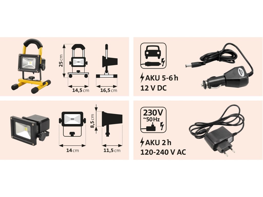 Přenosný LED nabíjecí reflektor je zdrojem příjemného bílého světla, které kvalitou odpovídá dennímu světlu. LED diody mají nízkou spotřebu energie při vysoké intenzitě světla. Reflektor lze používat jako přenosný zdroj světla se stojánkem bez napájecího kabelu a bez nutnosti připojení ke zdroji el. proudu, protože zdrojem el. energie je předem nabitý akumulátor. Je vybavena speciálním elektrickým obvodem „Constant current“, který dodává konstantní proud po dobu cca 2 hod., a tím zajišťuje po tuto dobu max. světelný výkon svítilny bez klesání intenzity světla a poté se svítilna vypne.Díky možnosti nabíjení z 12V zásuvky automobilu, malým rozměrům, mechanické odolnosti, odolnosti proti dešti, lze svítilnu mít jako součást výbavy automobilu a jako zdroj světla při práci, kempování, rybaření, na zahradě apod.- po připojení do el. sítě, lze reflektor používat i při vybité baterii