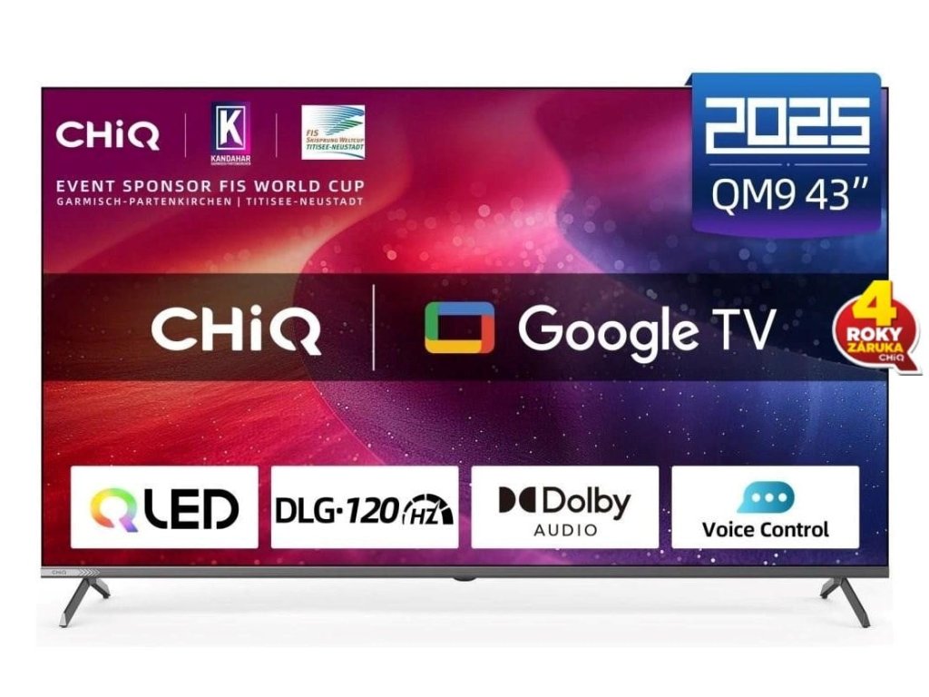 CHiQ U43QM9G TV 43" UHD QLED Google TVCHiQ U43QM9G, 43" (108 cm), QLED bezrámečková Smart Google TV 5.0, Ultra HD (4K), DLG 120 Hz, MEMC, Dolby Audio, dbx-tv, HDR 10, HLG, WiFi 2,4/5G, Bluetooth 5.0, webový prohlížeč, Google Assistant, Chromecast, O2 TV, YouTube, Netflix, Prime Video, paměť 2GB+16GB, 3x HDMI, 2x USB, CI slot, 20 W, energetická třída F.
