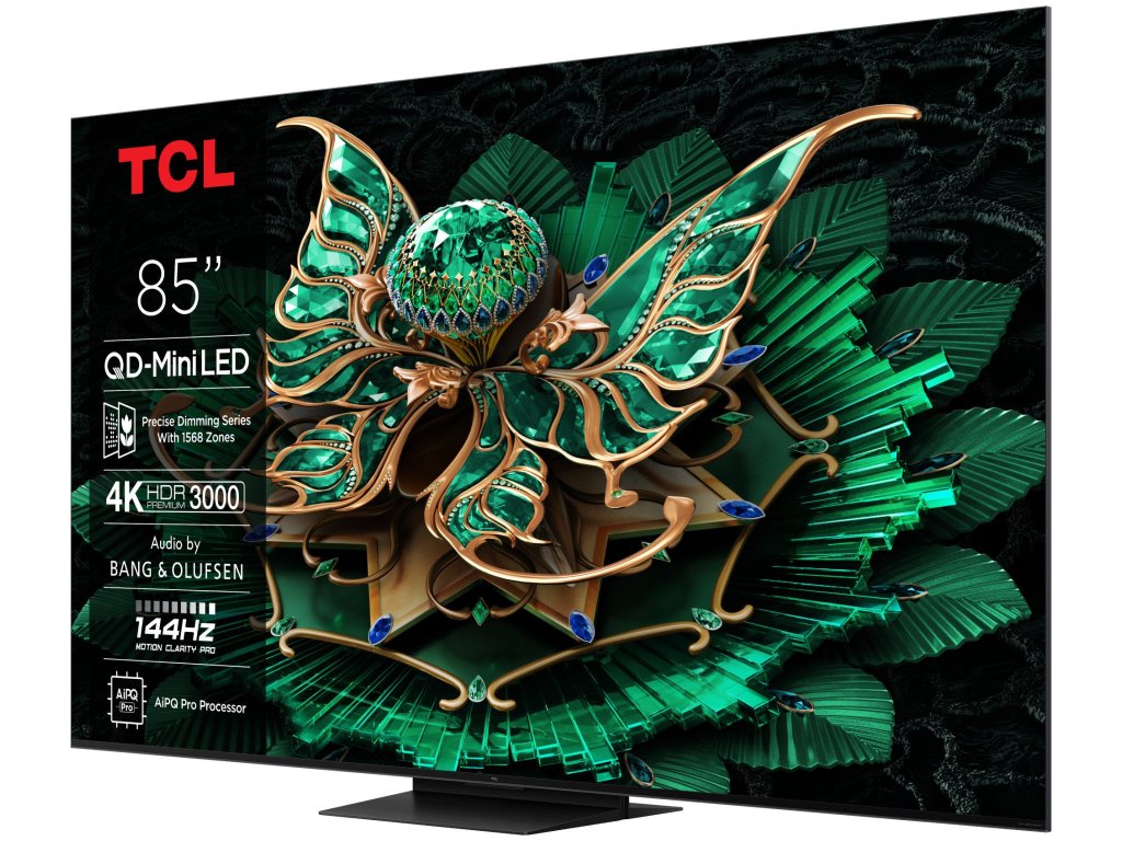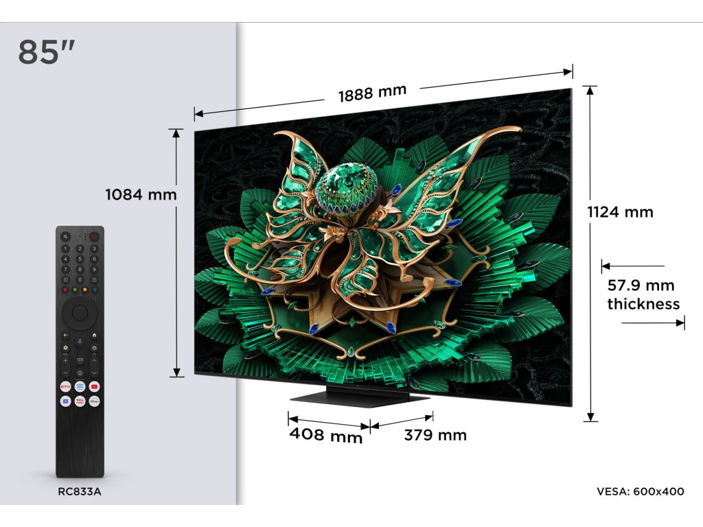 Televize – Google TV, Mini LED, 215cm, 4K Ultra HD, 100/120 Hz (144 Hz – herní režim), HDR10+, Dolby Vision, lokální stmívání, antireflexní obraz, DVB-T2/S2/C, 4× HDMI, 1× USB, LAN, WiFi, Bluetooth, DLNA, Chromecast, Miracast, HbbTV 2.0.3, herní režim, hlasové ovládaní, Google Assistant, Apple Airplay 2, párování s mobilním zařízením, Oneplay, VESA 600×400, repro 60 W, DTS:X, Dolby Atmos, Prostorový zvuk, vestavěný subwoofer, energetická třída DQLED