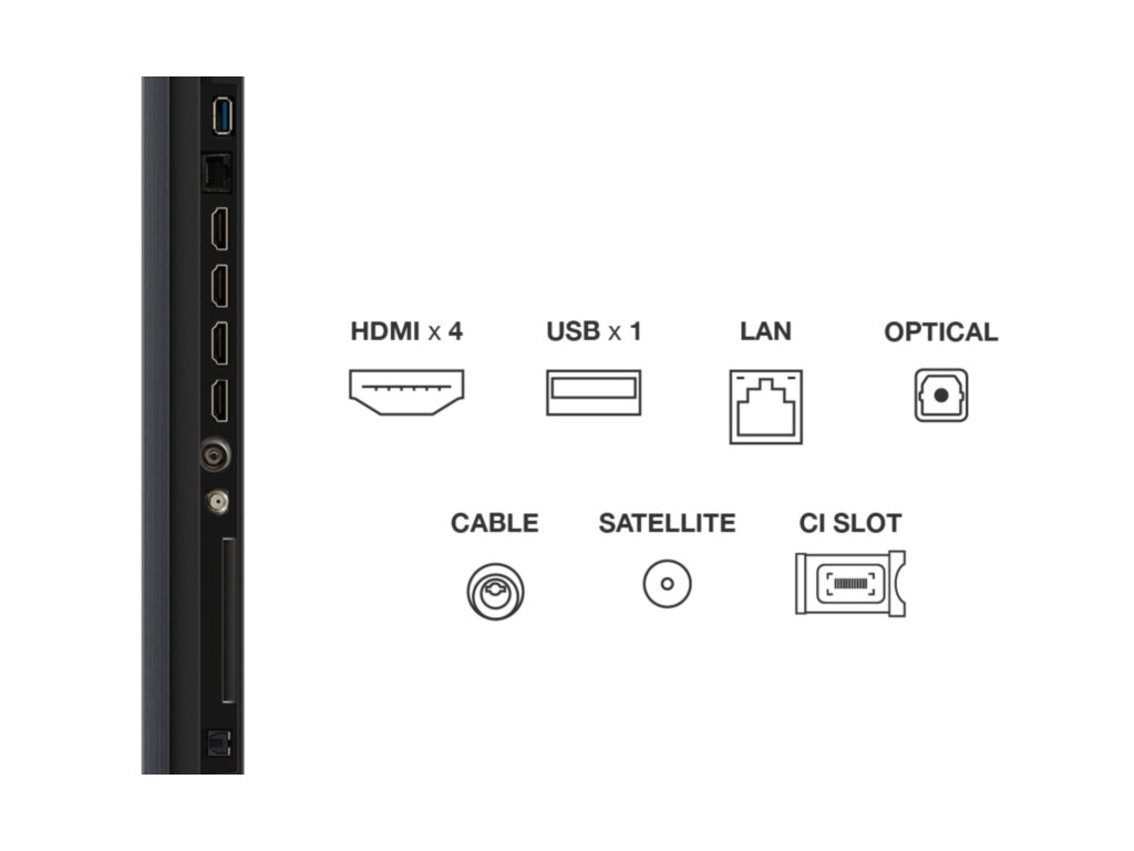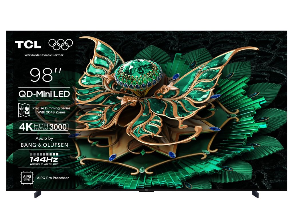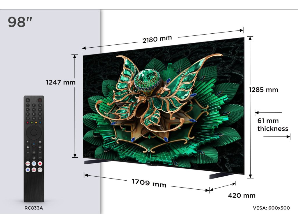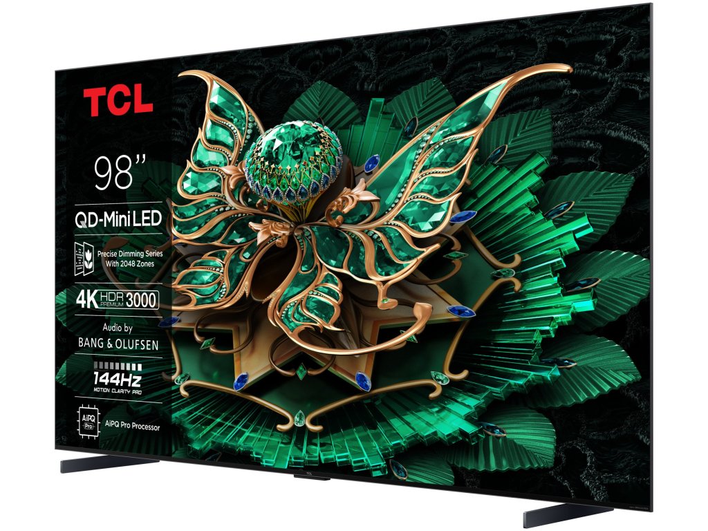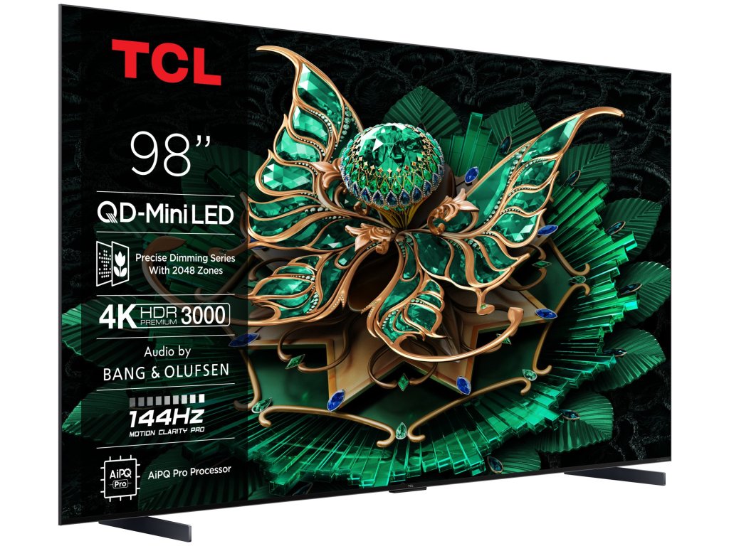 Televize – Google TV, Mini LED, 249cm, 4K Ultra HD, 100/120 Hz (144 Hz – herní režim), HDR10+, Dolby Vision, lokální stmívání, antireflexní obraz, DVB-T2/S2/C, 4× HDMI, 1× USB, LAN, WiFi, Bluetooth, DLNA, Chromecast, Miracast, HbbTV 2.0.3, herní režim, hlasové ovládaní, Google Assistant, Apple Airplay 2, párování s mobilním zařízením, Oneplay, VESA 600×500, repro 60 W, DTS:X, Dolby Atmos, Prostorový zvuk, vestavěný subwoofer, energetická třída EQLED