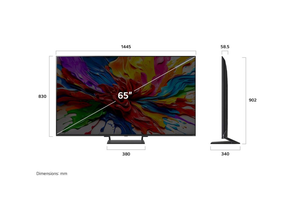 | Rozměry bez podstavce (V x Š x H): | 830 mm (V) x 1 445 mm (Š) x 59 mm (H) |