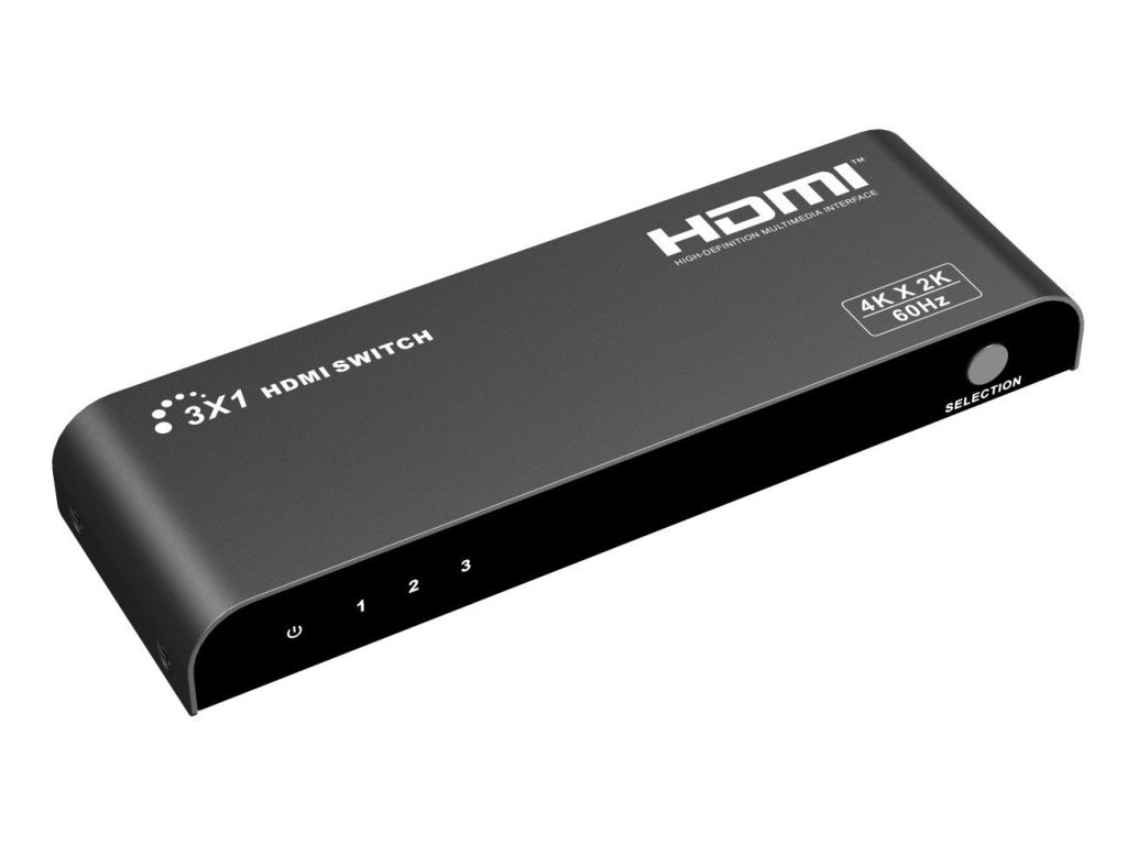 PremiumCord 4Kx2K@60Hz HDMI switch 3:1 kovový s dálkovým ovladačem a napájecím adaptérem3 HDMI zařízení sdílí 1 HDMI výstupní zařízení (obrazovku). Výběr zařízení tlačítkem nebo dálkovým ovládáním.