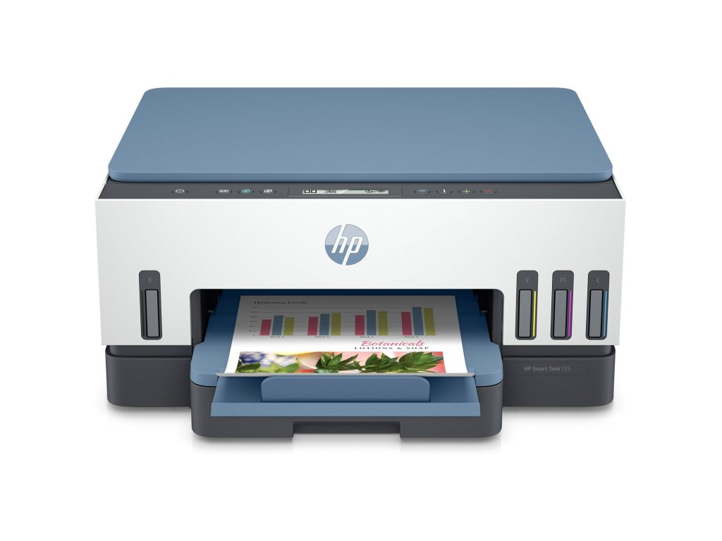 Obsah balení: HP Smart Tank 725 All-in-One; 3x 135ml originální lahvička s černým inkoustem HP GT53XL; Originální lahvička s azurovým inkoustem HP GT52; Originální lahvička s purpurovým inkoustem HP GT52; Originální lahvička se žlutým inkoustem HP GT52; Napájecí kabel; Černá tisková hlava HP; Tříbarevná tisková hlava HP; Průvodce nastavením; Referenční příručka; Leták s upozorněním na inkoust; Regulační leták; Záruční letáky; Další informace o plnění a výtěžnosti jsou k dispozici na adrese http://www.hp.com/go/learnaboutsupplies