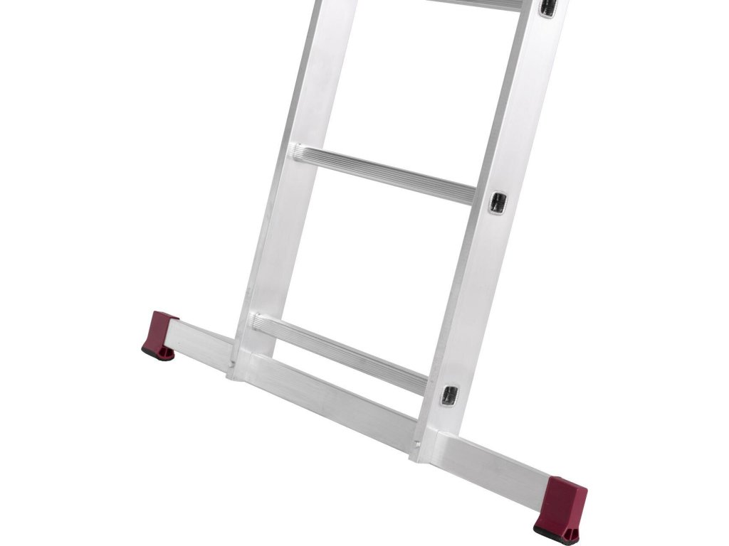 Trojdílný mnohoúčelový hliníkový žebřík je možné použití jako opěrný žebřík, štafle nebo výsuvný žebřík. Výhody a charakteristické znaky - Příčle s profilováním po obvodu - Ocelové vodící profily umožňují snadné vysouvání jednotlivých částí žebříku - Široká stabilizační traverza zajišťuje bezpečné stání - Protiskluzové patky - Bezpečnostní hákové pojistky proti samovolnému vysunutí částí žebříku při transportu a používání - Možnost odejmutí třetího dílu - Maximální pracovní výška 6,2 m - Maximální zatížení 150 kg - Certifikace EN 131 pro domácí i profesionální použití RozměryPři platbě penězi je možné dostat zajímavou nabídku neboli akční cenu a tu Vám rádi uděláme když napíšete na info@megabike-cyklo.cz