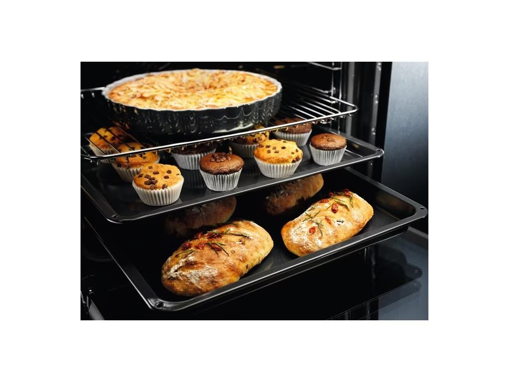 Výbava trouby - plechy: 1 smaltovaný koláčový plech na pečení, 1 odkapávací pekáč šedý smalt
