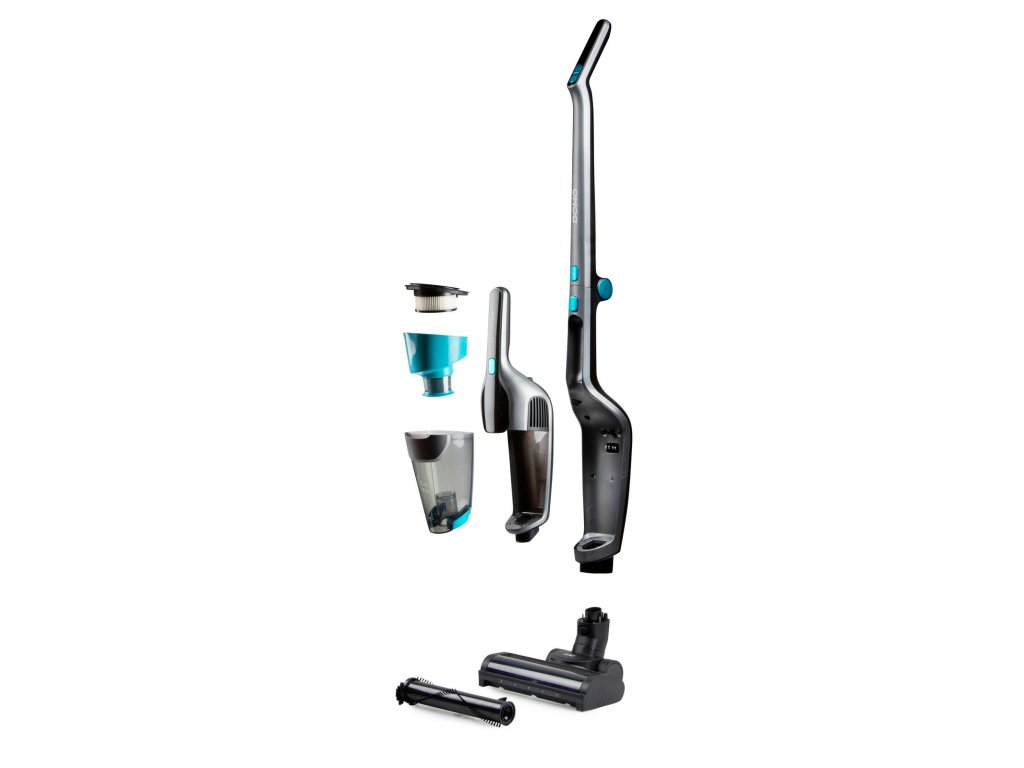 Skládací rukojeť umožňuje kompaktní skladování a parkovací režim udržuje vysavač ve vzpřímené poloze. Součástí balení je nabíjecí stanice, štěrbinová hubice a prachový kartáč pro maximálně snadné použití.