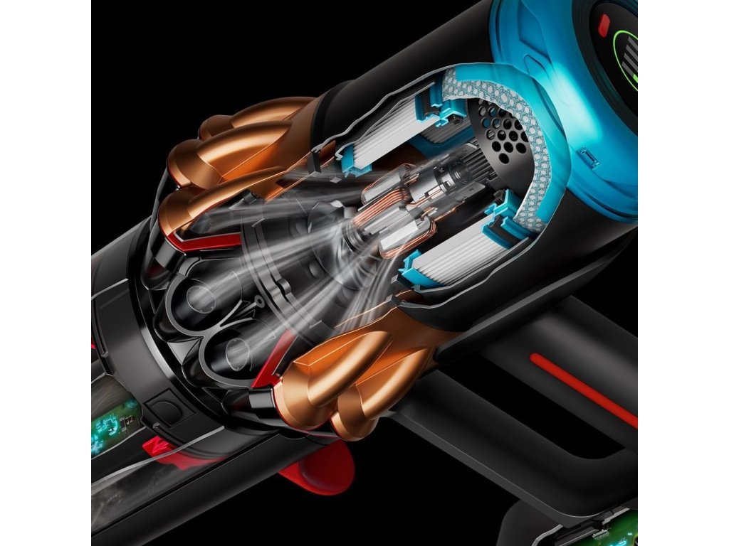 Řez akumulátorovým vysavačem Dyson V16 Piston Animal zobrazující motor uvnitř.