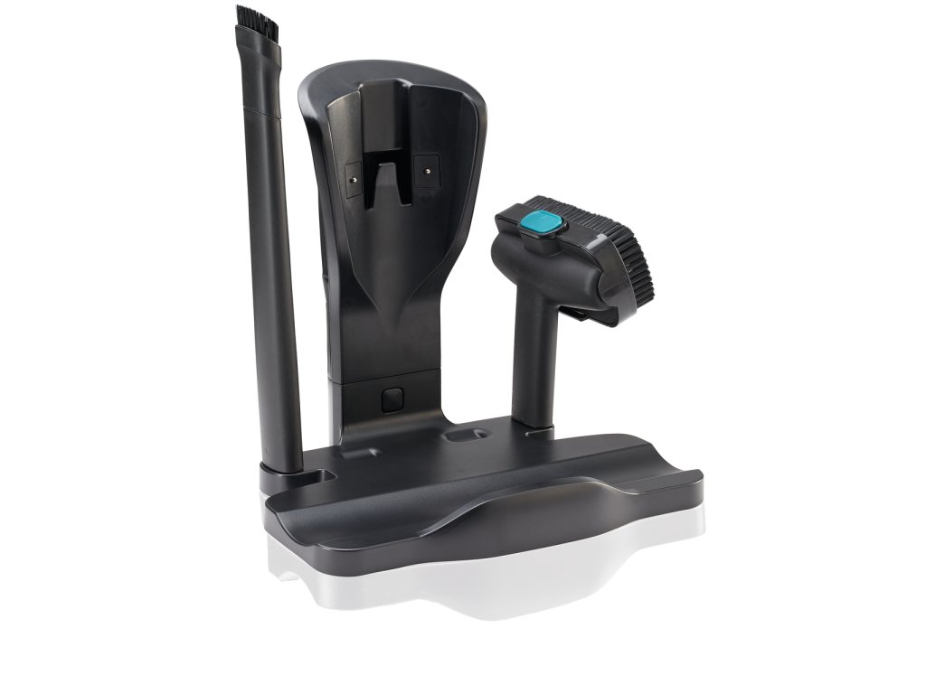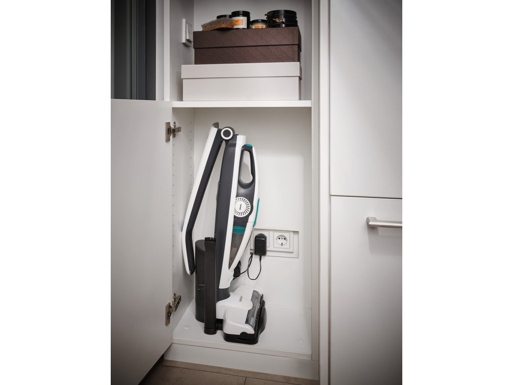 Samozřejmostí je, že akumulátorový vysavač lze zaparkovat kdekoli díky funkci volně stojícího parkování. Pomocí sklopné rukojeti jej lze také složit pro úsporu místa. Elektricky ovládaná podlahová hubice s technologií dvou štětin optimálně sbírá nečistoty. Bezsáčková cyklonová technologie zajišťuje výkonné vysávání a šetří drahé nákupy sáčků.