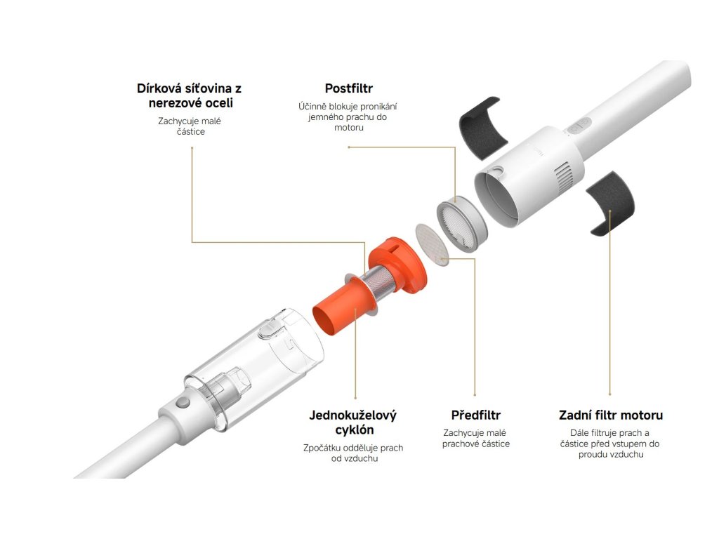 Vysavač je vybaven 5stupňovým vysoce přesným filtračním systémem a dosahuje účinnosti filtrace až 99,8 %*. Dokáže filtrovat částice o velikosti až 0,3 µm* a zachytit prach, bakterie a alergeny, aby zajistil pokaždé čisté a čerstvé emise.