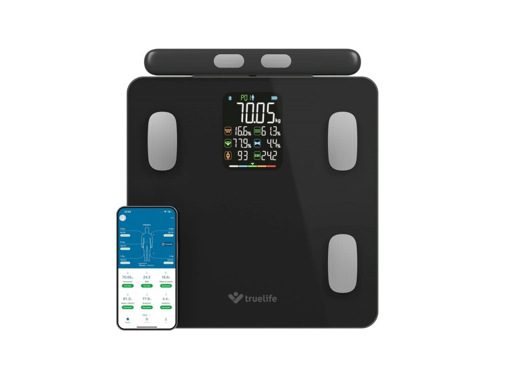 Rozumí vašemu tělu do detailuZjistěte o svém těle více než jen pouhou hmotnost. Každý jsme originál a jedinečnou skladbu má i naše tělo, proto o něm chytrá váha TrueLife FitScale W8 BT Black prozradí detaily. Technologie TrueLife PrecisionIQ+® využívá 8 vysoce citlivých senzorů a s pomocí bioelektrické impedanční analýzy změří celkovou tělesnou kompozici. Na přehledném barevném LCD displeji zobrazí celkem 7 údajů - kromě hmotnosti také třeba procento tuku, svalů či vody. Propojením přes Bluetooth s aplikací získáte přehledný report zahrnující 15 tělesných indexů včetně jejich popisu. Váha je schopna sledovat až 16 uživatelů, u kterých v aplikaci zaznamená 15 posledních měření. Každého uživatele automaticky rozezná, takže není třeba nic přepínat. Kdokoliv má však možnost použít váhu i bez aplikace. Prémiové tvrzené krycí sklo je elegantní a velmi odolné s nosností až 180 kg. Při vážení si můžete zvolit jednotky, a to buď kilogramy nebo libry. Vážící odchylka činí pouhých 0,1 kg, takže vaše výsledky budou opravdu přesné.