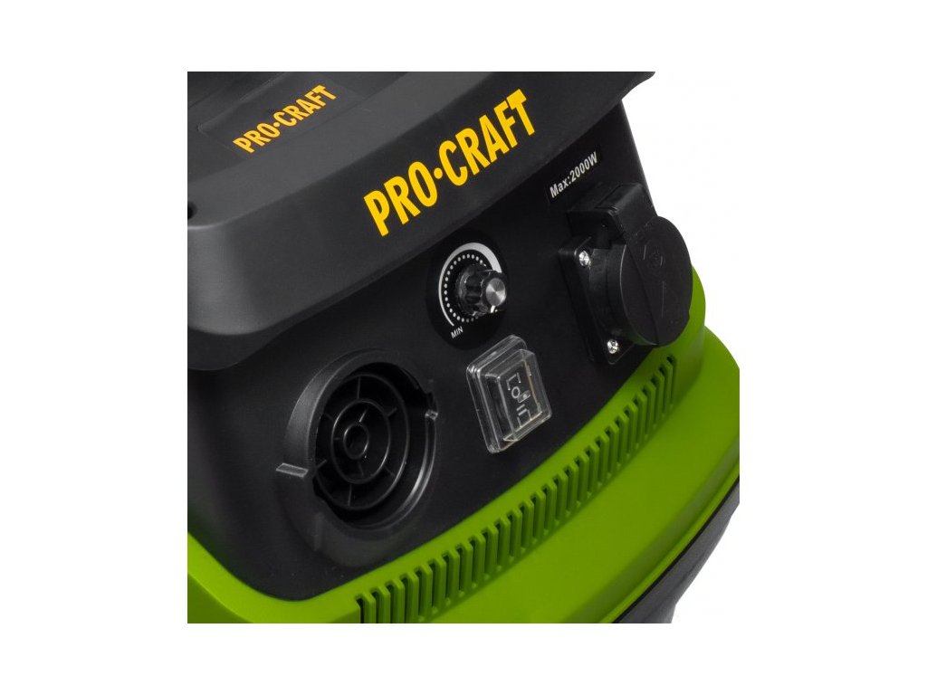Průmyslový vysavač Procraft VP2000 je určen k mokrému i suchému vysávání. Je možné ho použít na staveništích, dílnách truhlářských a lakovacích provozech, ale i jako domácí vysavač, nebo k vysávání auta. Je vhodný pro odstraňování třísek, pilin a sádrového prachu. Vysavač má 4 m sací hadici a telekopicky nastavitelnou ocelovou trubku Silný motor s příkonem 1600 W zaručuje vysoký sací výkon o 18kPa a dokáže tak účině vysát prach ze strojů a těžší nečistoty ze stavby. Poradí si s rozlitou vodou, kterou vysává do nádoby (čištění koberců). Plynulou regulace sací síly, manuální oklep prachových filtrů. Rychloupínací spony usnadní výměnu pytlů. Automatický systém zapínání integrovanou zásuvkou 230V včetně funkce doběhu usnadní práci. Vysavač je dobře pojízdným díky kombinaci dvou velkých kol a dvou otočných, vybaven pohodlnou rukojetí pro přenášení. Součástí dodávky je odsávací hadice, hepa filtr, teleskopická kovová trubka, hubice, sáčky a kola. Balení karton.