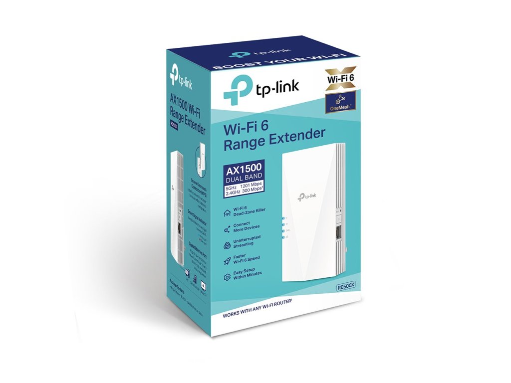 WiFi extender TP-Link RE500X WiFi 6 AP/Extender/Repeater, AX1500 300/1201Mbps, 1x GLAN, OneMesh Nevíte kde uplatnit Benefity obecně, zeptej se info@megabike-cyklo.cz