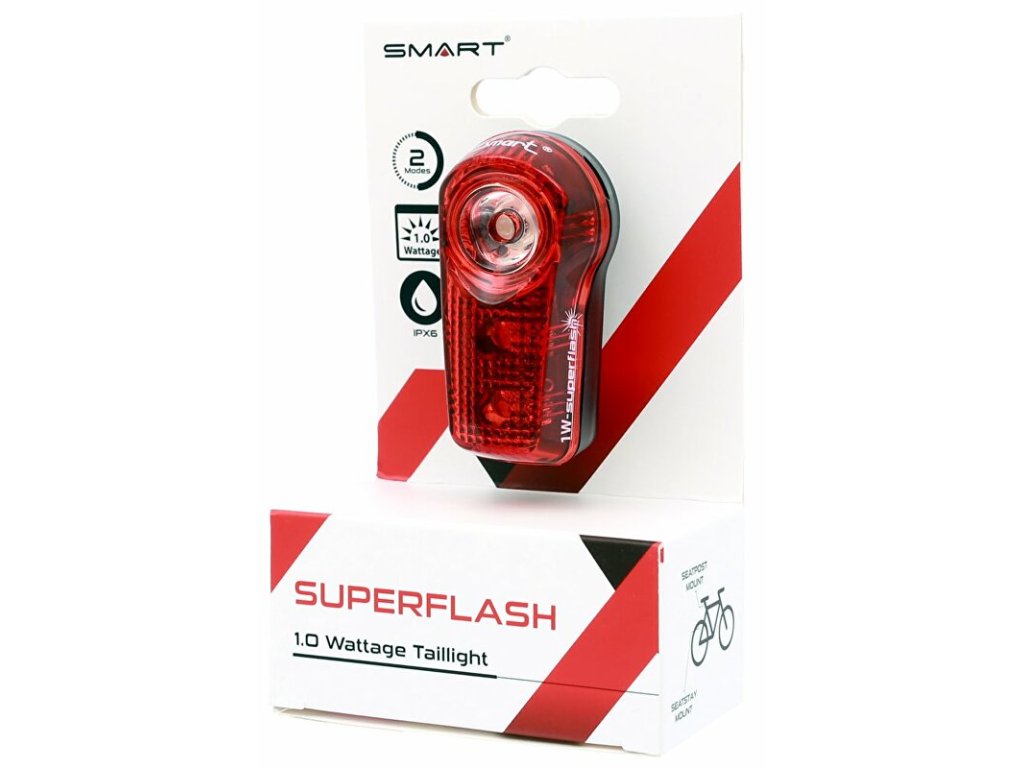 Zadní blikačka SMART Superflash 1 W s extra výkonnou diodou. Perfektní zpracování včetně tvarované těsnící gumičky a netříštivého materiálu ABS.• 1 extrémně svítivá dioda 1 W pro perfektní viditelnost + 2× Hi-Power LED
