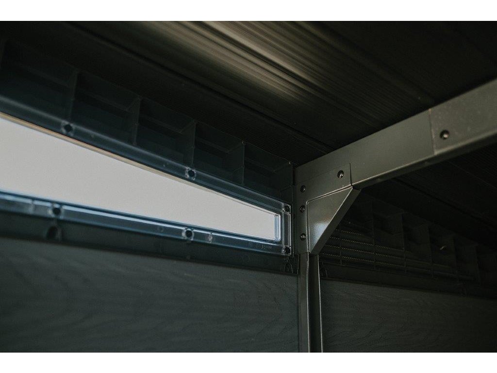 Zahradní domek je vybavený silnou střechou, která je vyztužená ocelí. Vydrží zatížení až do 200 kg/m², takže hravě odolá i haldě sněhu. Má dvojité dveře a malá okénka, skrze které se dovnitř dostane sluneční svit. Výrobce se také postaral o vhodný ventilační systém. Do domku se dostane dostatek vzduchu, který brání hromadění vlhkosti. Přední dveře jsou opatřeny západkou, na kterou lze nasadit visací zámek pro větší bezpečnost.