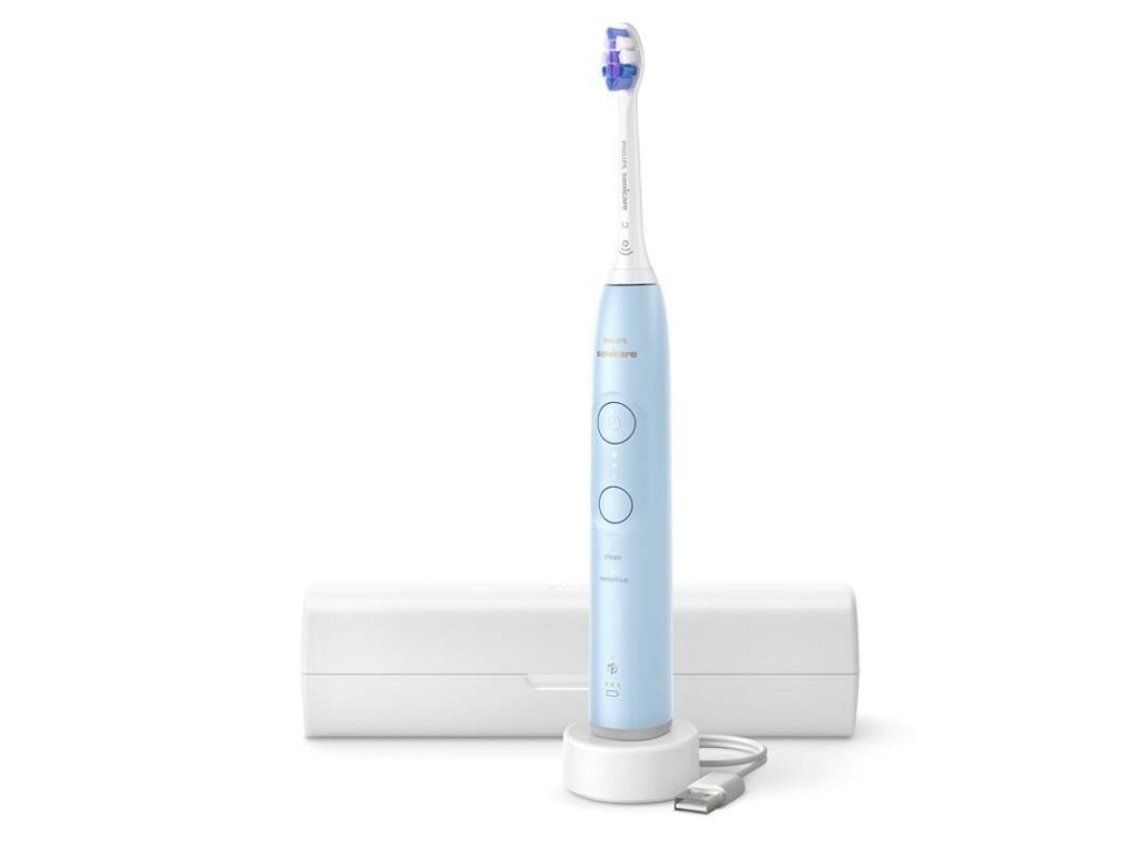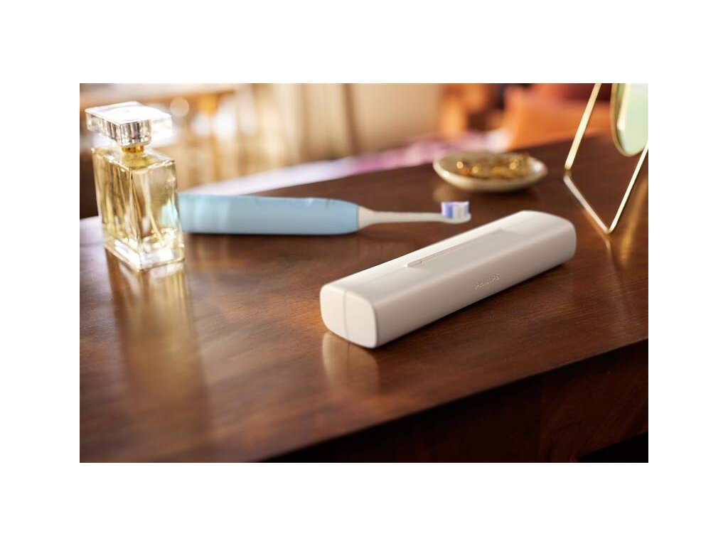 Balení obsahuje: 1 sonický kartáček Philips Sonicare 6100, 1 hlavice Philips Sonicare Sensitive, nabíjecí základna, cestovní pouzdro.