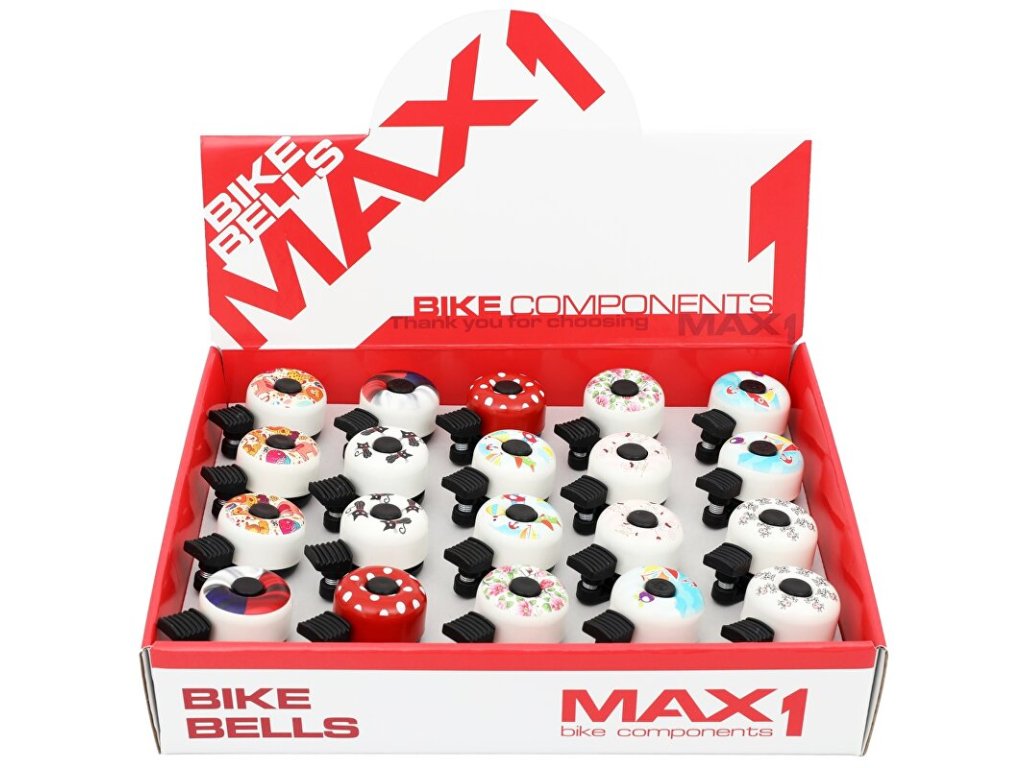 Sada zvonků na řidítka MAX1 Mini. !!Skladba motivů se může měnit!!- otočná palička v úhlu 360 st.